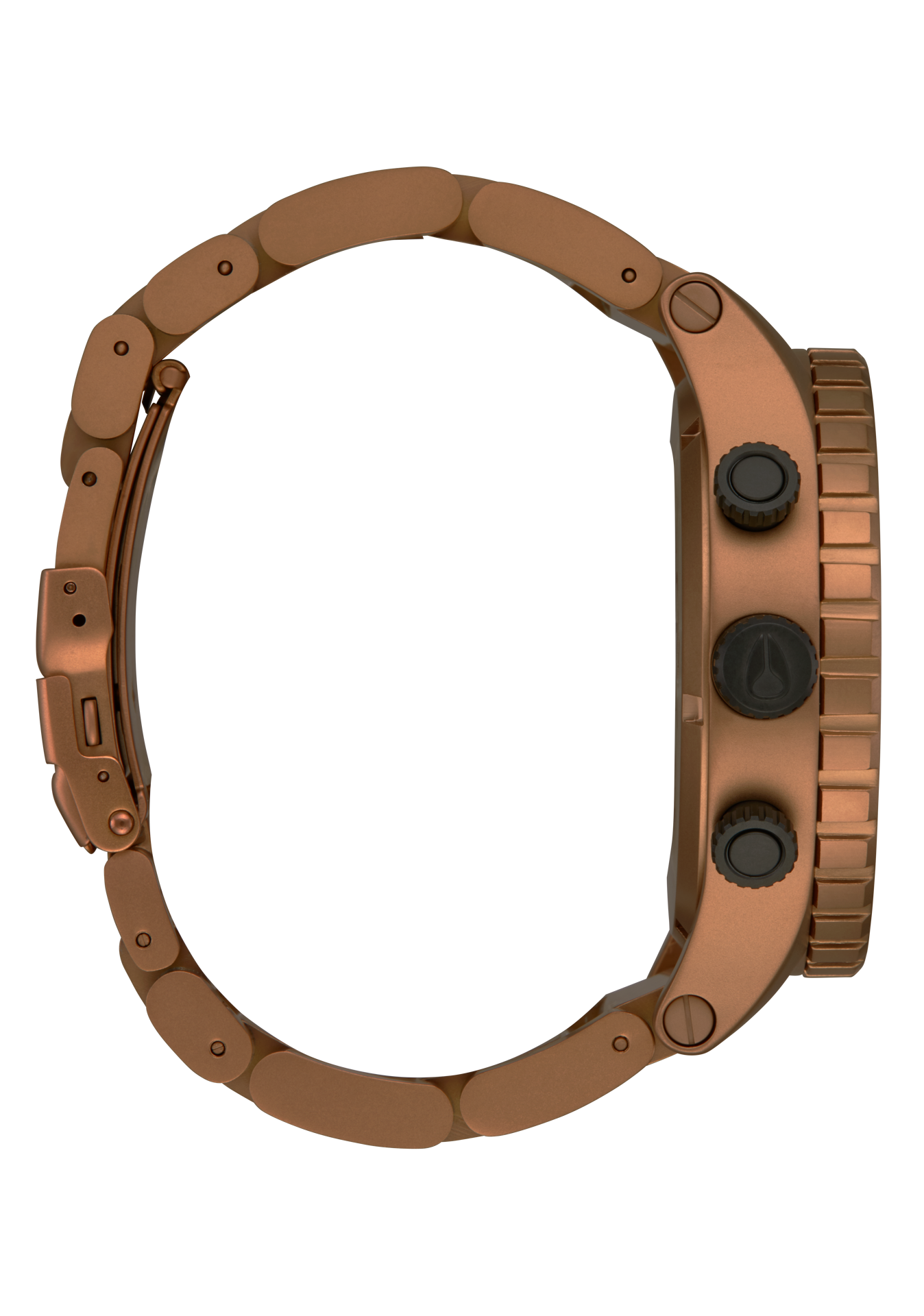 The crown on the Nixon 51-30 Chrono is located at the 9 o'clock position to prevent wrist bite when worn on the left hand, providing greater comfort during active use. This design choice allows the watch to be worn without the crown digging into the wrist, which is great if you're getting your hands dirty.