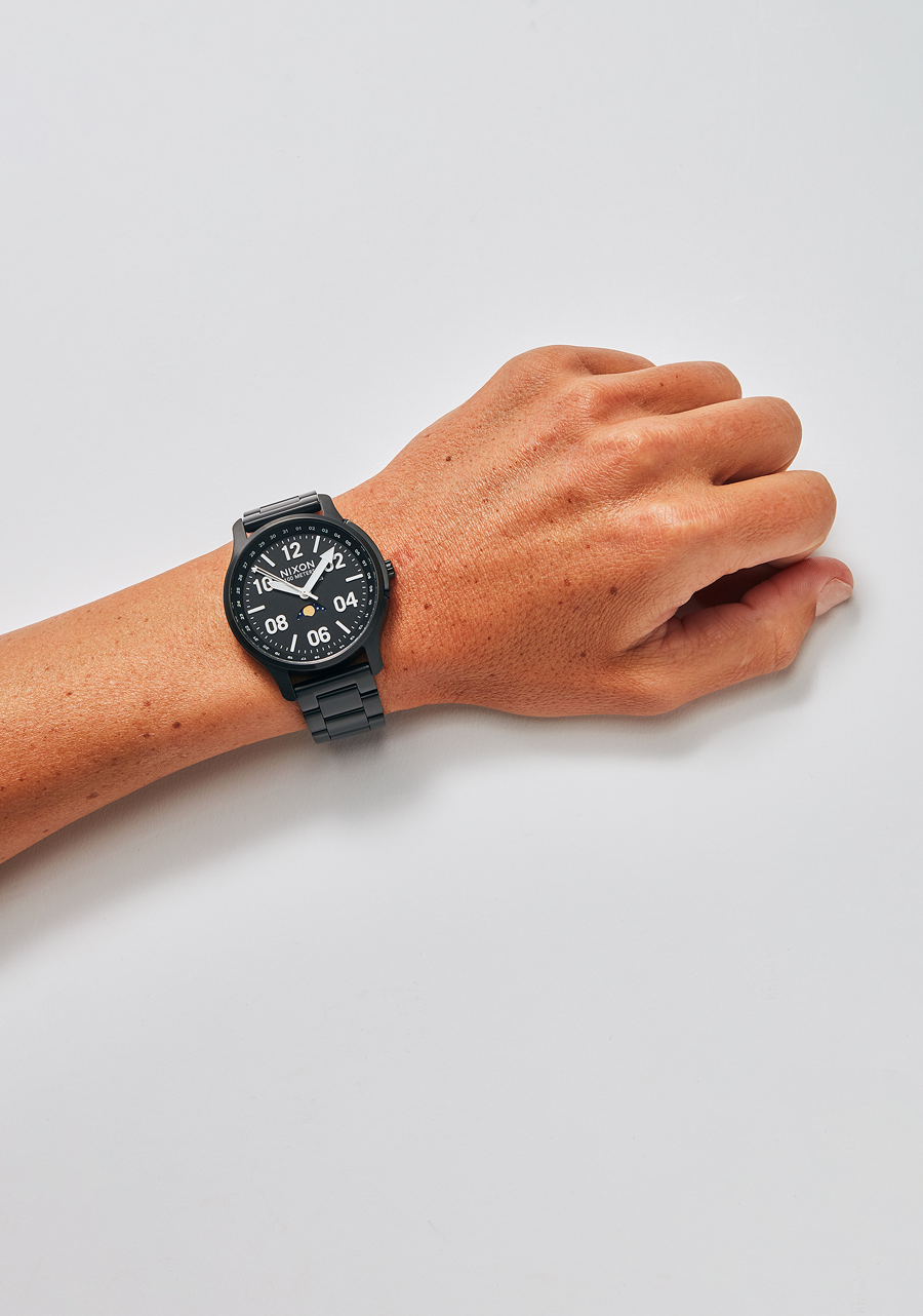 The inner dial ring acts as a calendar, with days of the month tracked by the four-hand movement. Moon phase function lets you know how much moonlight you’ll have to navigate with