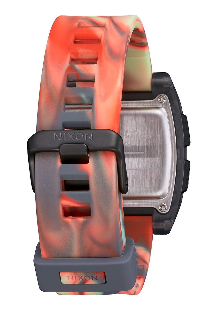 38mm, 100 meter/10 ATM, custom injection molded TR90. Custom molded polycarbonate gasketed pushers, stainless steel screw down caseback, and stainless steel screw bar lugs.