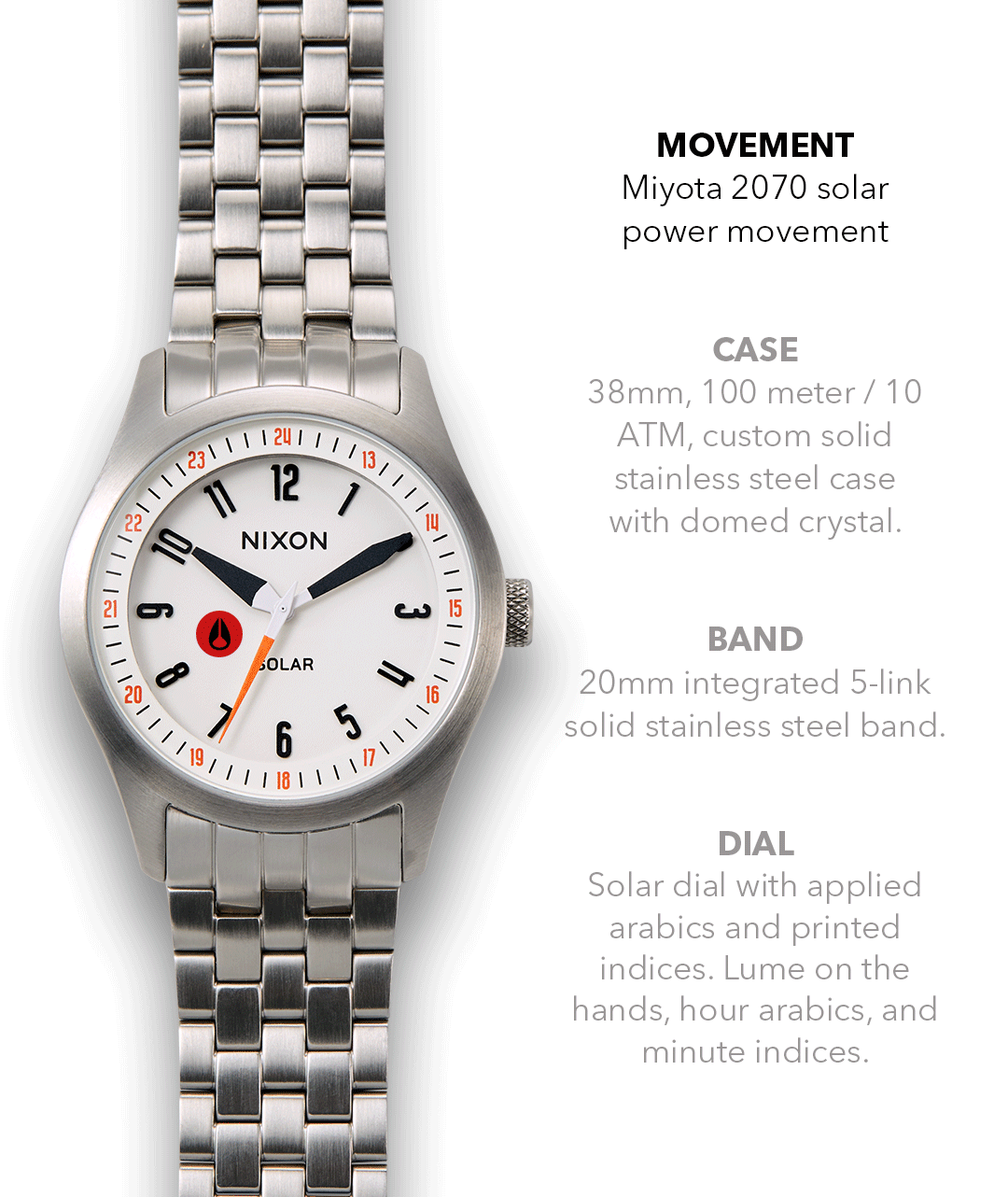 Introducing the modern field watch that's built for the journey and designed for the destination. Go all day with its solar-powered movement and head boldly into any condition with a highly-durable K1 crystal and 10 ATM/100 meter waterproof construction. Then, arrive at your destination already dressed up with its sleek integrated stainless steel bracelet. Plus, with Lume on the hands and dial, the Echo 38 will gladly pull an all-nighter with you.