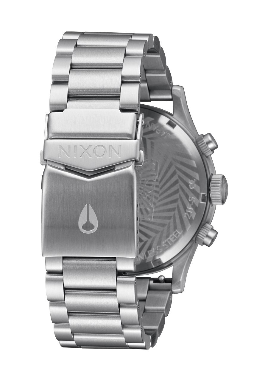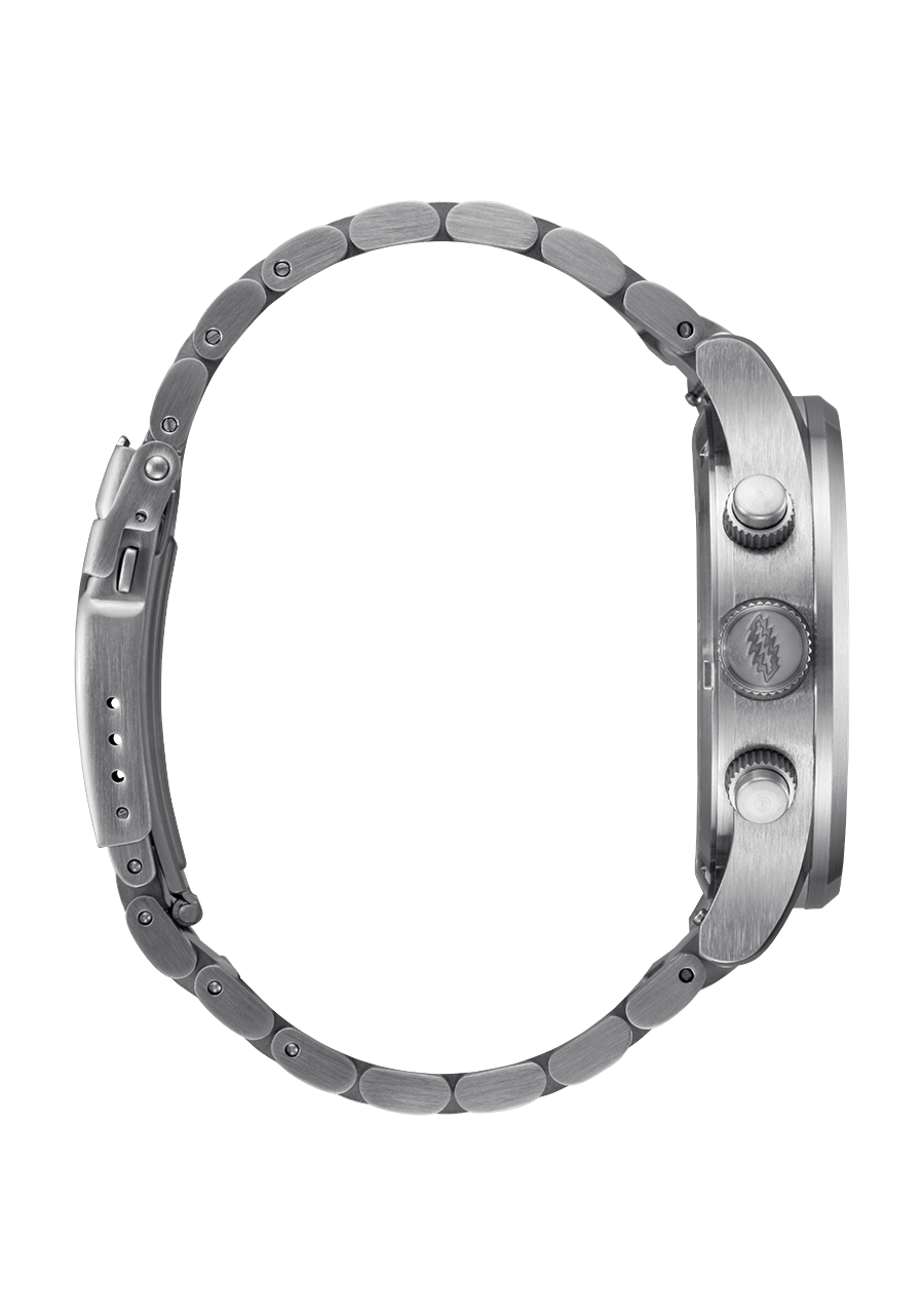 Custom molded Grateful Dead 13-point lightning bold seconds hand and enamel filled 3 o’clock crown with 13-point lightning bolt etched in. The 6-hand chronograph features 3 Steal Your Face skulls alongside the date window at 4 o’clock.