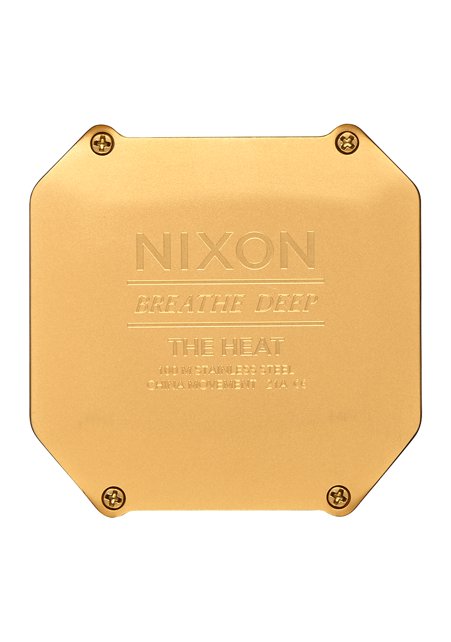 The Nixon Heat features a 38mm custom ultra-thin 8mm stainless steel case with stainless steel pushers and a hardened mineral crystal for protection. The band is a 20mm injection molded rubber strap with a perforated design, engineered for durability, breathability, and comfort. The watch is designed for maximum performance in sports, offering robust protection against impacts and water resistance up to 100 meters / 10 ATM.
