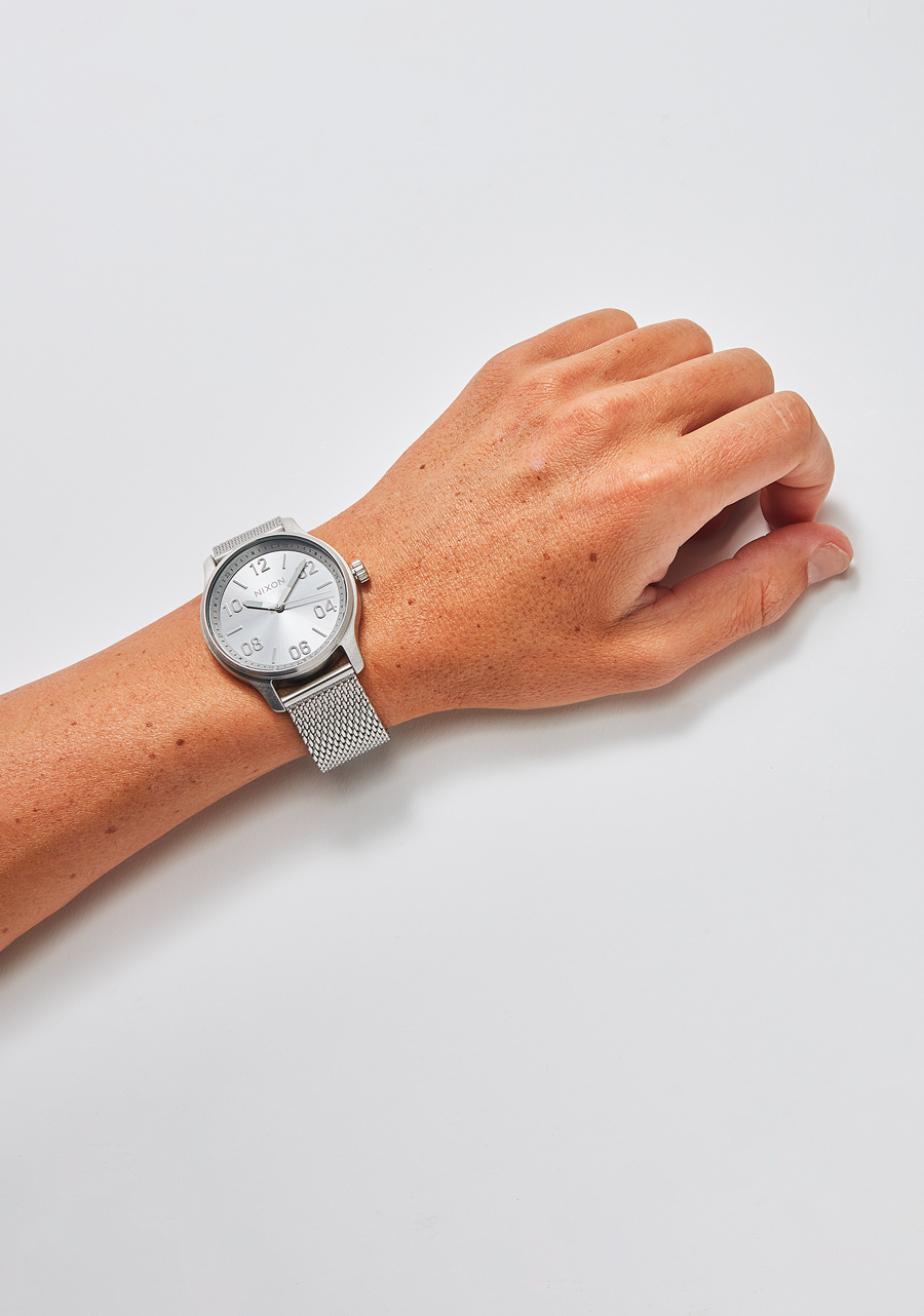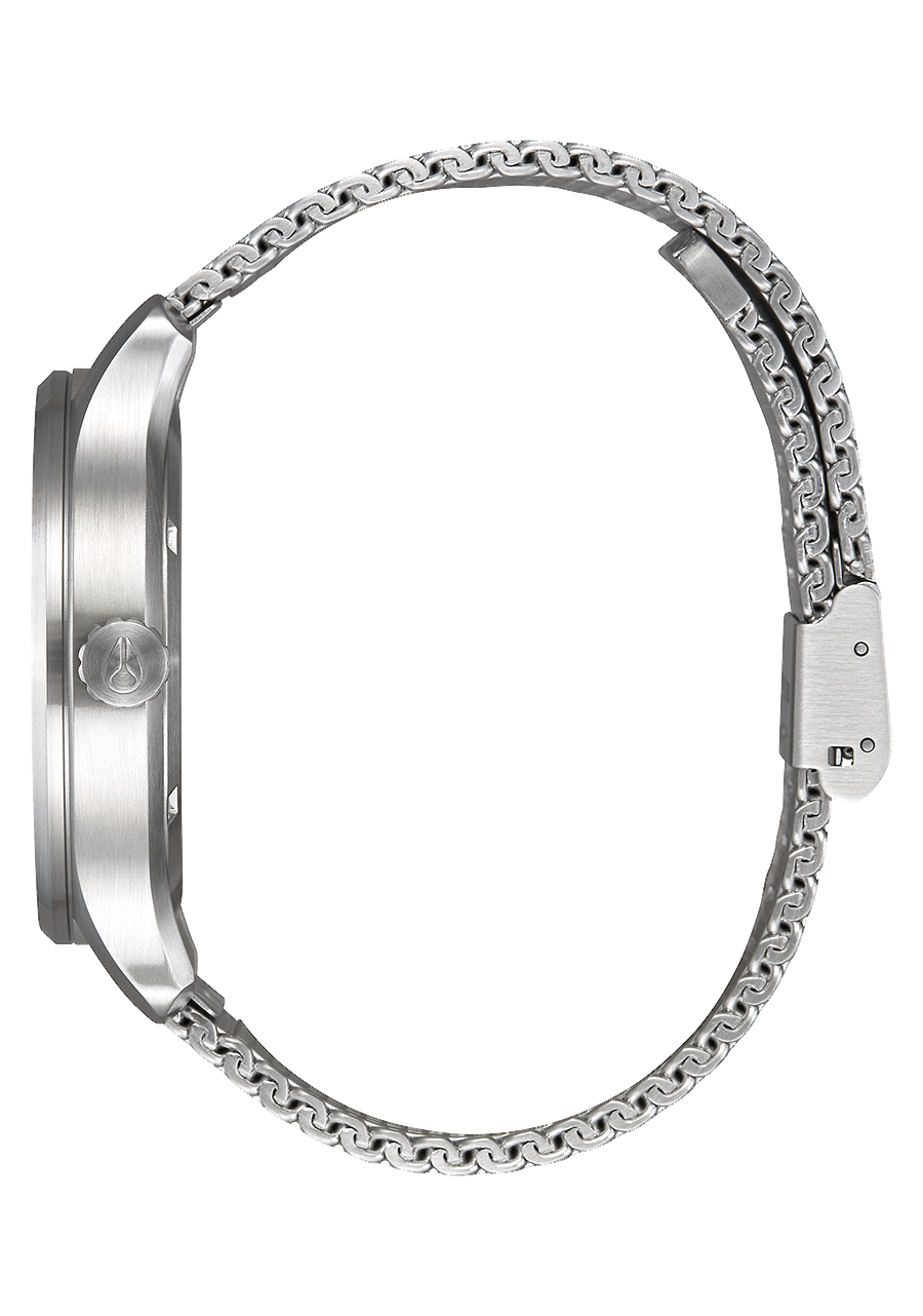 42mm custom solid stainless steel case with a 100 meter / 10 ATM water rating. Comes with a hardened mineral crystal, stainless steel screw down caseback and spring pin lugs.