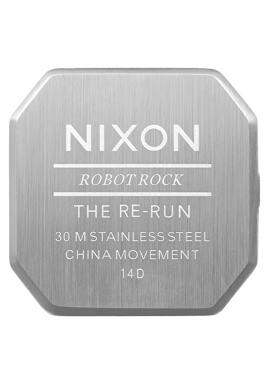 The Nixon Re-Run watch features a case made of solid stainless steel and hardened mineral crystal, providing durability for daily wear. The band is a 5-link stainless steel jewelry-style bracelet with a stainless steel locking clasp, ensuring a secure fit. The watch is designed to be durable enough for active wearers, with features like injection-molded polyurethane pushers to enhance its throwback design and functionality.