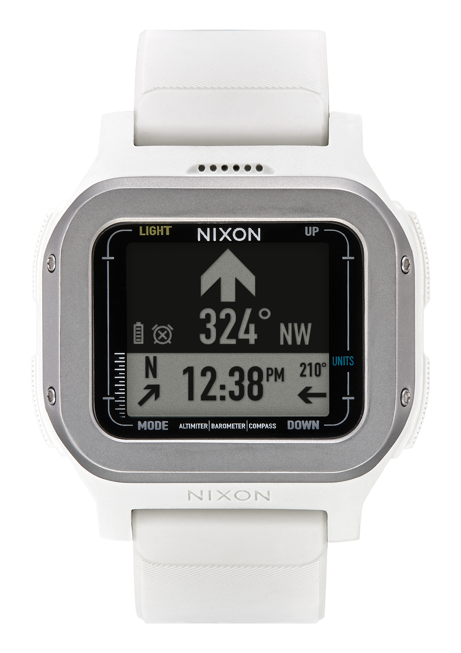 Custom digital module with high resolution MLCD with front light. Functions include altimeter, barometer, compass, thermometer. Camp mode with weather alert, session mode with runs tracker, dual time zones in 12 or 24 hr format, date, chronograph, and alarm.