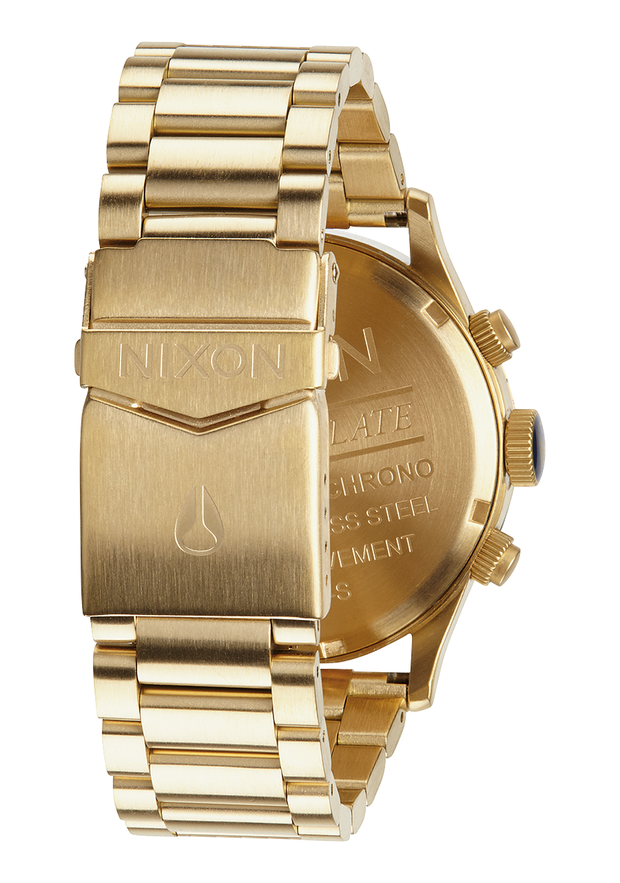 The Nixon Sentry Chrono uses a Miyota Japanese quartz 6-hand chronograph movement. It includes a chronograph function with a 24-hour subdial and date placement at 4 o'clock.