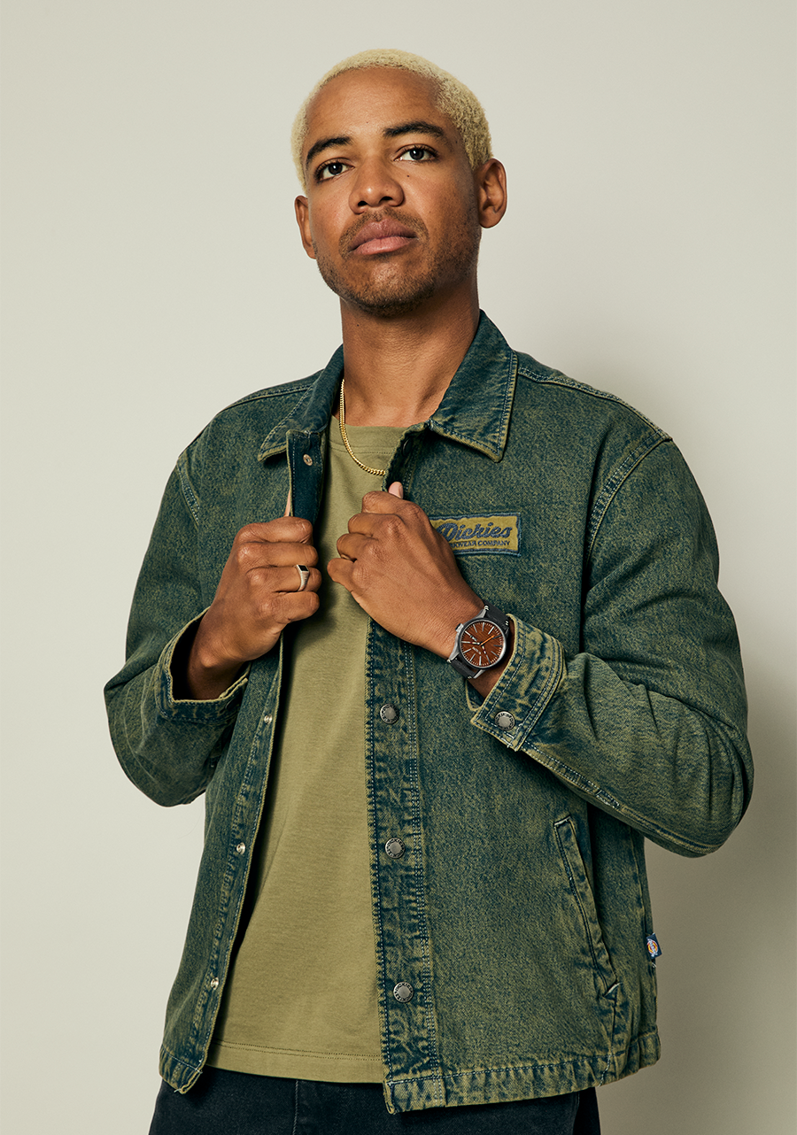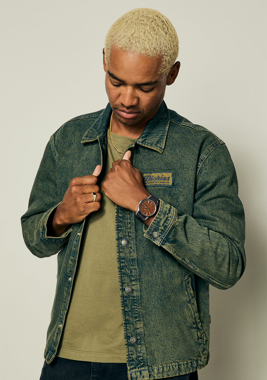 Dial features applied stick indices, printed seconds track and custom molded hands. Day window includes English and Spanish languages.