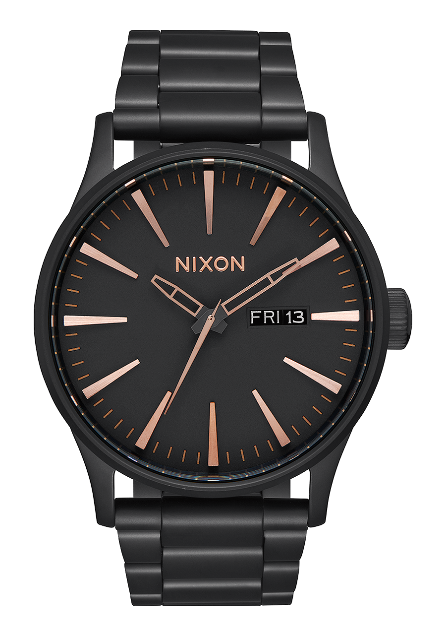 The Nixon Sentry Stainless Steel watch uses a Japanese Miyota 2305 quartz 3-hand movement and features a bilingual day and date function in English and Spanish.