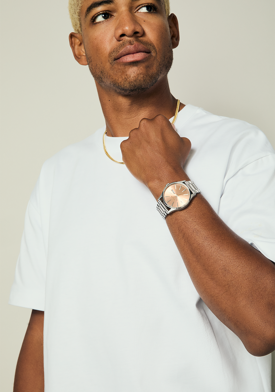 There are two ways to adjust the Sentry Stainless Steel. Smaller adjustments can be made with the micro adjuster and larger adjustments can be made by removing or adding watch links. Visit the Nixon blog to learn how to resize this watch.