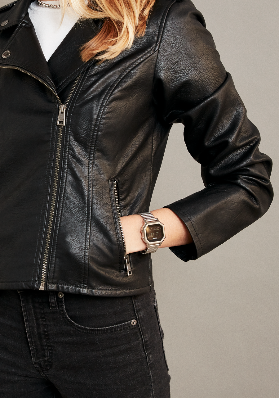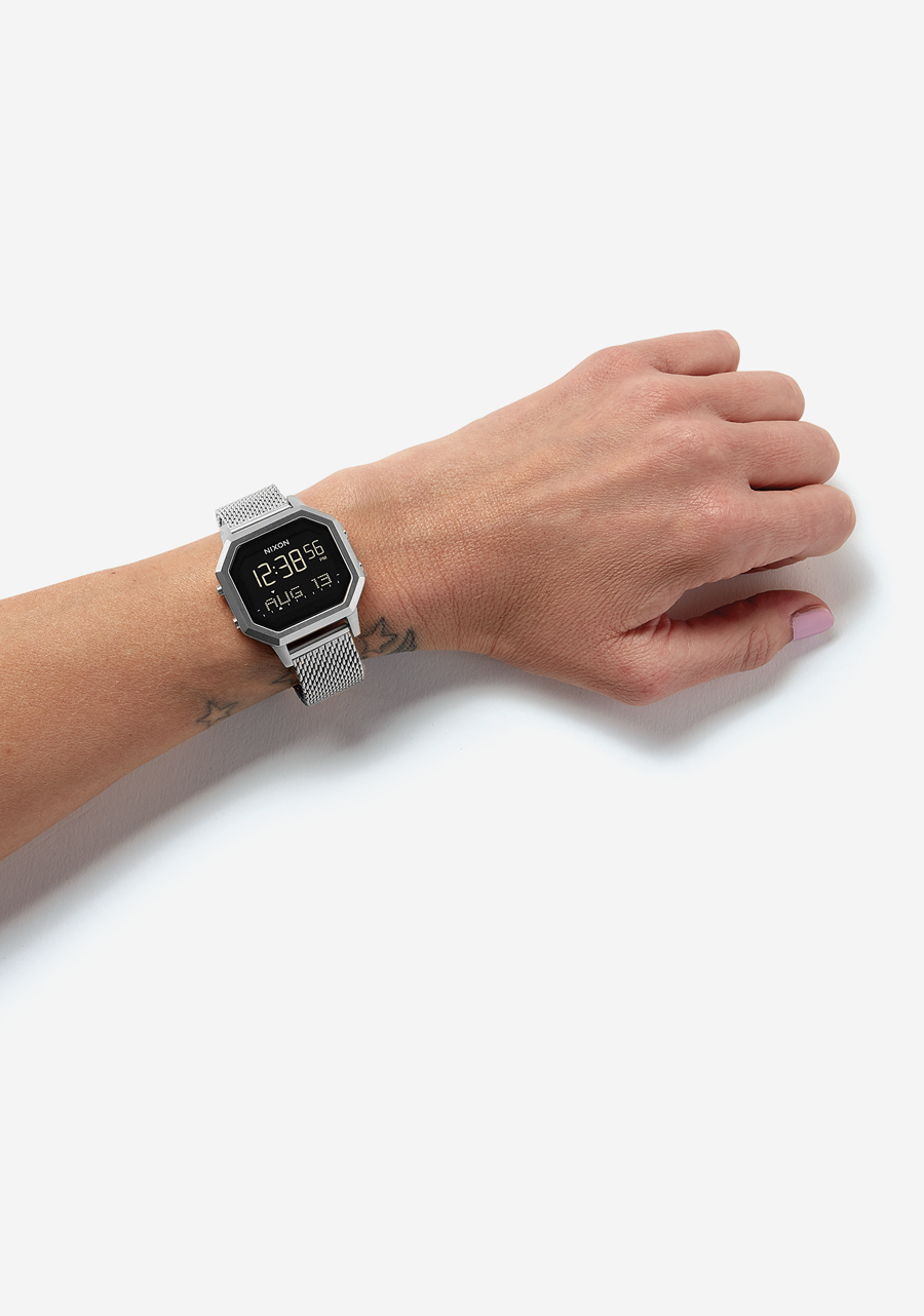 The Siren Milanese watch features a stainless steel case and an 18mm custom stainless steel Milanese bracelet with a stainless steel sliding adjustment buckle and screw-bars. To adjust the Milanese bracelet for a secure fit, you can use the sliding adjustment buckle to tighten or loosen the band. This involves sliding the buckle along the band to the desired position. A tool to begin this adjustment is included in the watch box. For more information visit the Nixon blog.