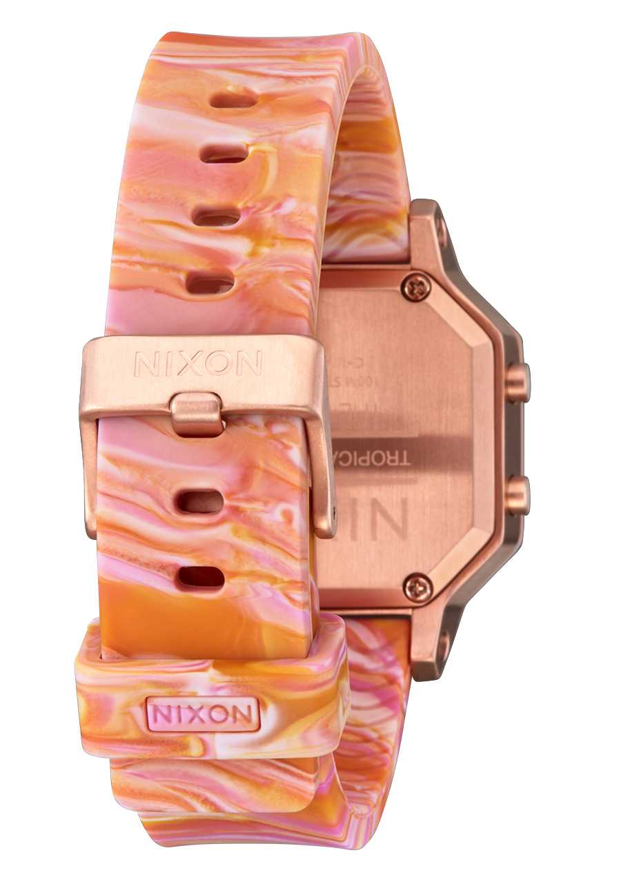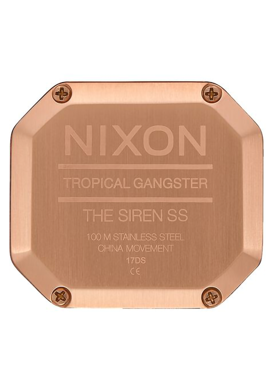 The Nixon Siren Stainless Steel uses a custom stainless steel case with stainless steel screw bars and pushers, and a custom injection molded ultra-soft silicone band with a solid stainless steel buckle and screw bars. The watch is water resistant up to 100 meters / 10 ATM, making it highly durable for water and sports use.