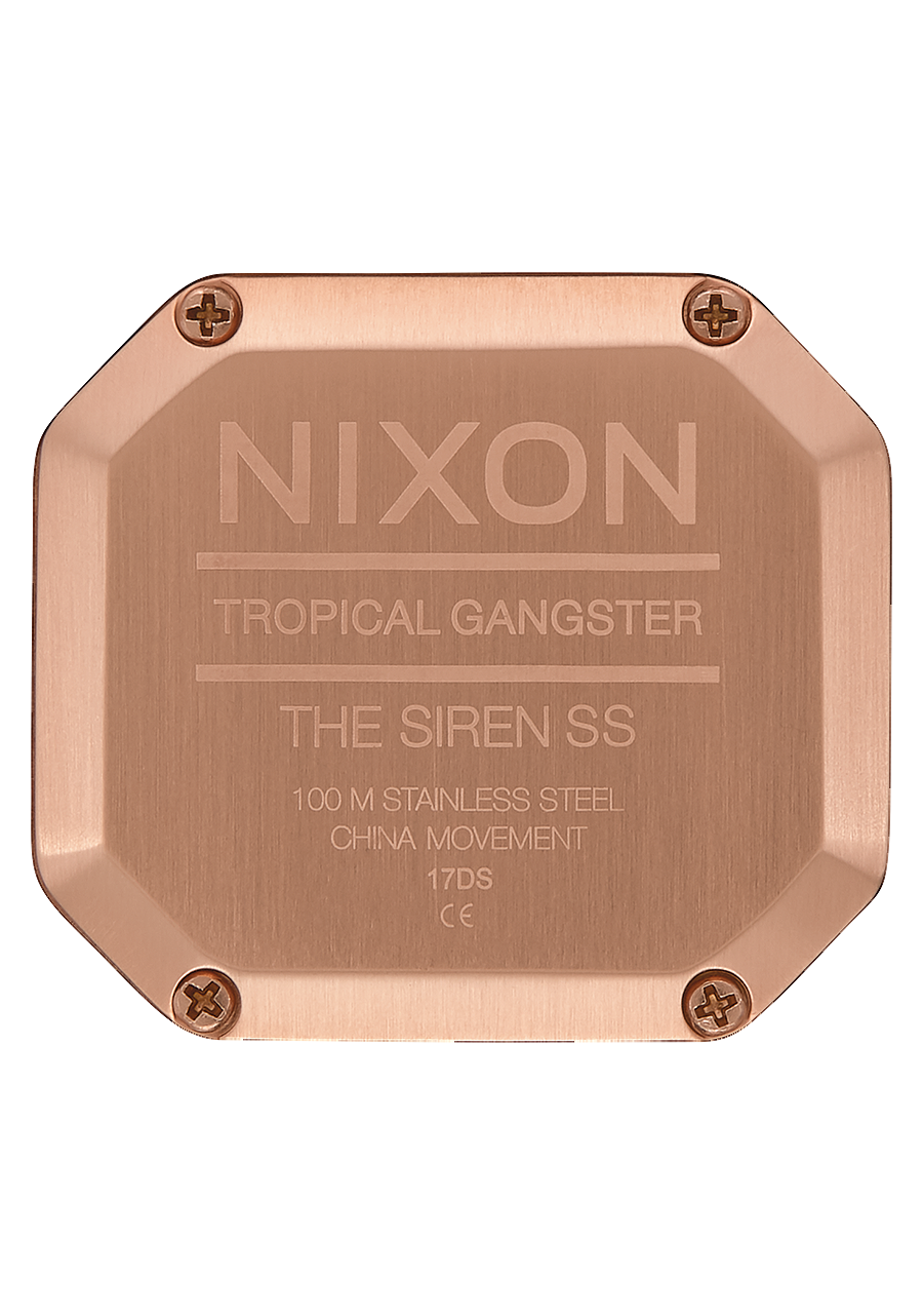 The Nixon Siren Stainless Steel uses a custom stainless steel case with stainless steel screw bars and pushers, and a custom injection molded ultra-soft silicone band with a solid stainless steel buckle and screw bars. The watch is water resistant up to 100 meters / 10 ATM, making it highly durable for water and sports use.
