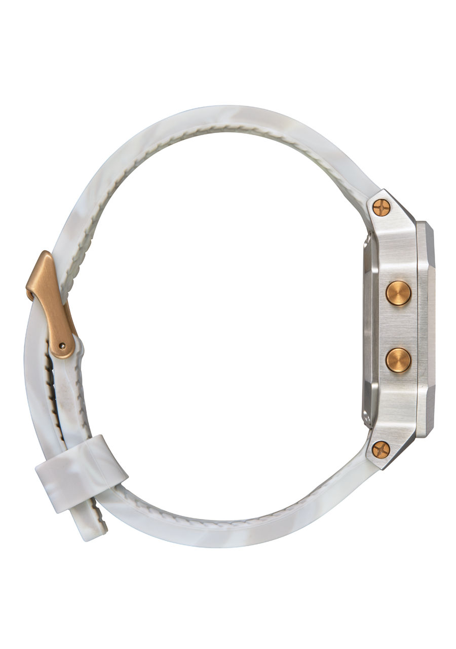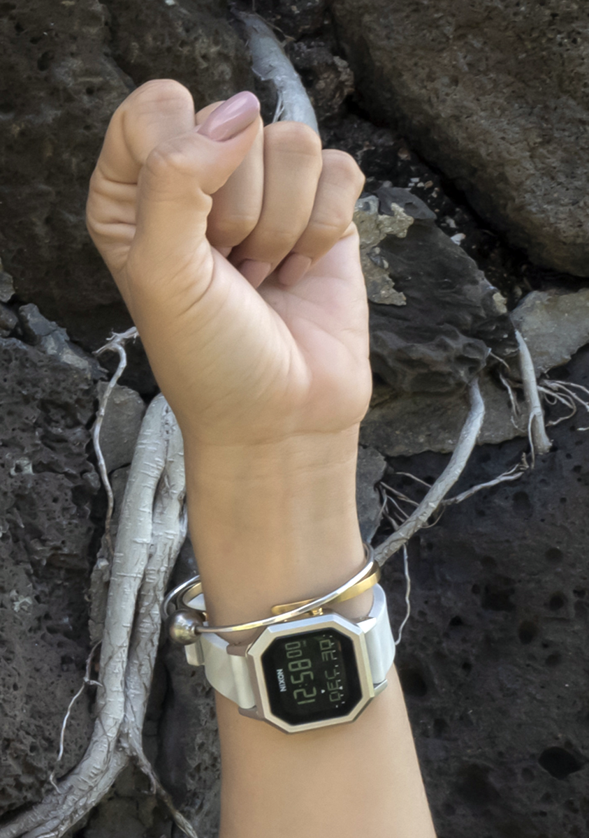 The Nixon Siren Stainless Steel uses a custom stainless steel case with stainless steel screw bars and pushers, and a custom injection molded ultra-soft silicone band with a solid stainless steel buckle and screw bars. The watch is water resistant up to 100 meters / 10 ATM, making it highly durable for water and sports use.