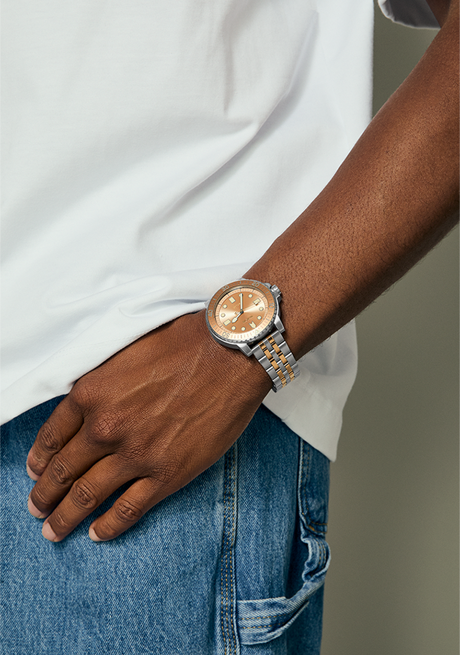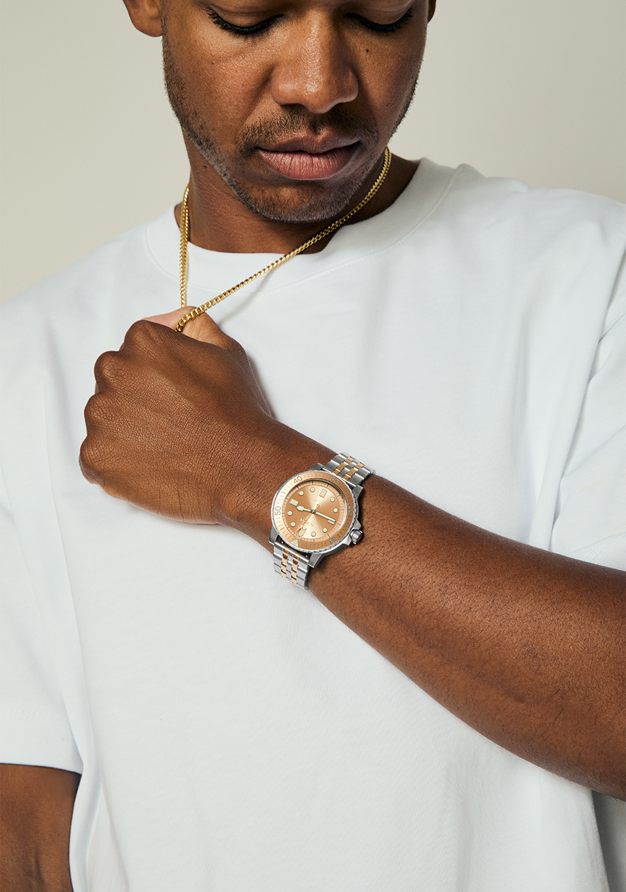 A dive inspired watch you can wear to the dive bar. The Stinger 44 resonates to a time where analog ruled the depths of the unknown by allowing divers to know how long they have been underwater with the rotating bezel. Rule the night in style with luminous indices for low light visibility. A 44mm stainless steel case weighted just right for everyday use, a 5-link bracelet that will catch any eye day or night, and did we mention it's powered by the sun?