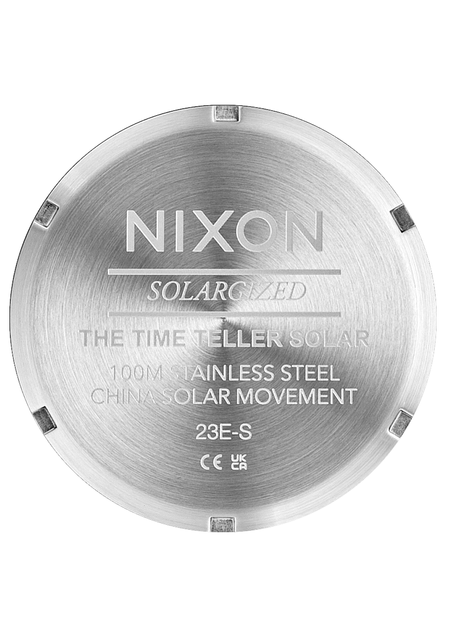 The Time Teller Solar watch features a Miyota 2170 Japanese solar-powered quartz movement, which charges with sunlight or ambient light and runs for up to four months on a single full charge. A few minutes of direct sunlight is enough to provide a full day of power, making it a reliable and low-maintenance timepiece. Visit the Nixon blog to learn more about how solar movements work.